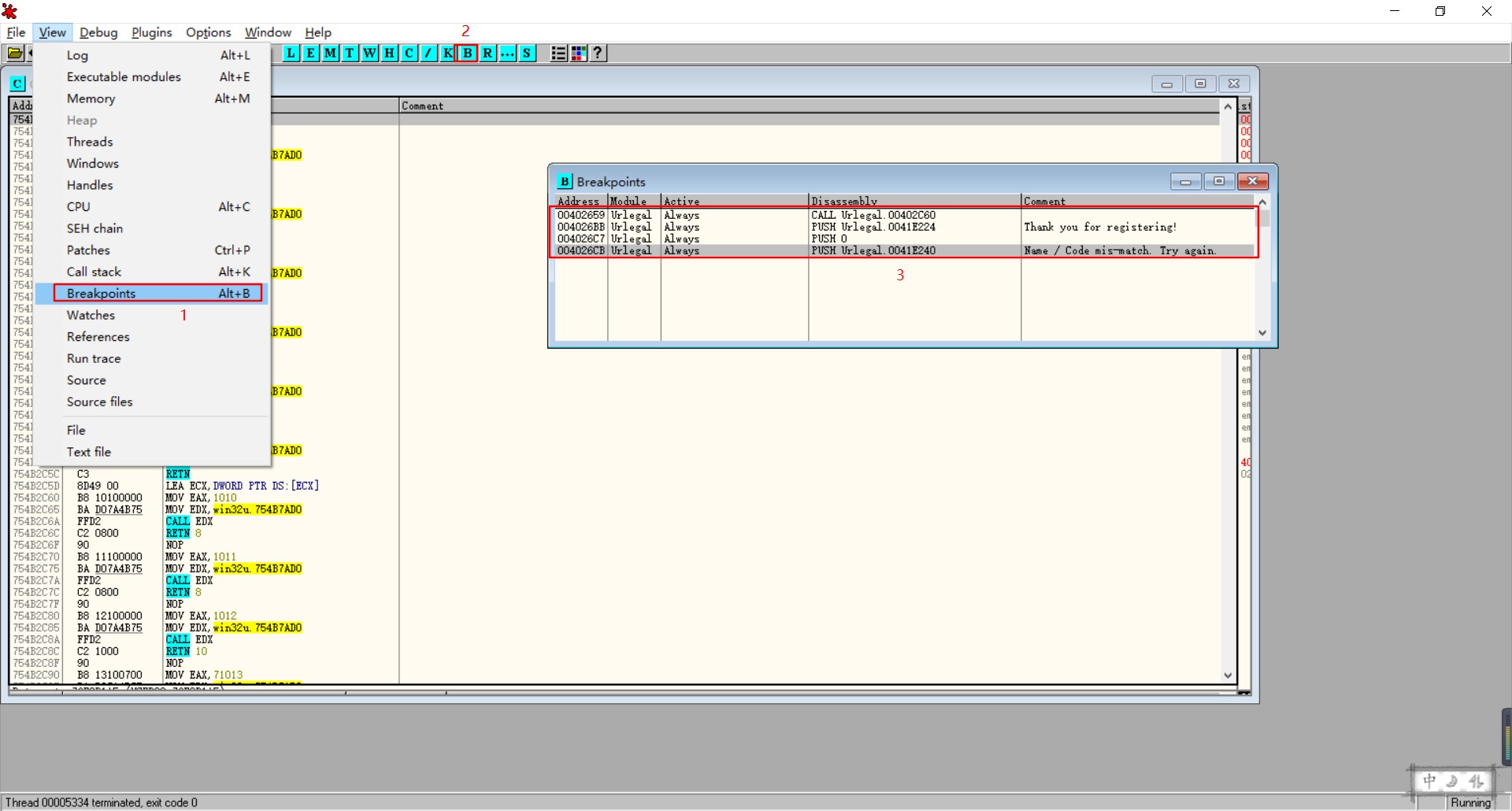 可以看到标记1处为跳到标记2处的关键跳之一,还有另外一个关键跳为JNZ下面的JE跳,而一般而言,关键跳的前一个CALL指令为关键CALL指令,现对JNZ上的CALL指令进行断点。